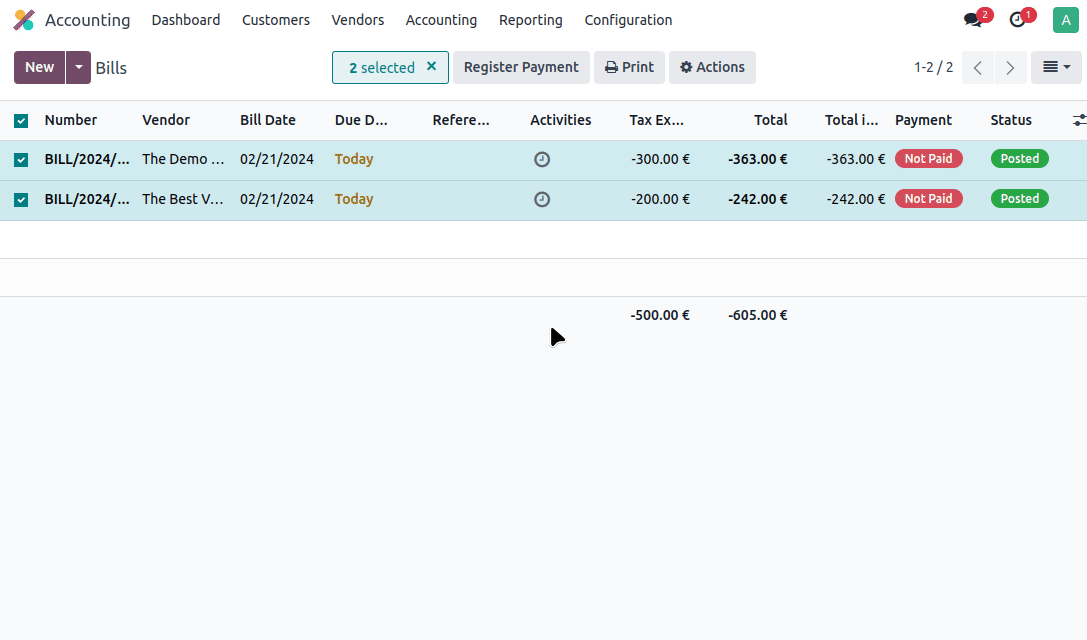 Let's start by selecting a few bills that need to be paid. In your accounting app, under Vendor Bills, you will be able to identify the bills with the Payment column set to "Not Paid". A filter can be used to only display the bills that are "Unpaid".