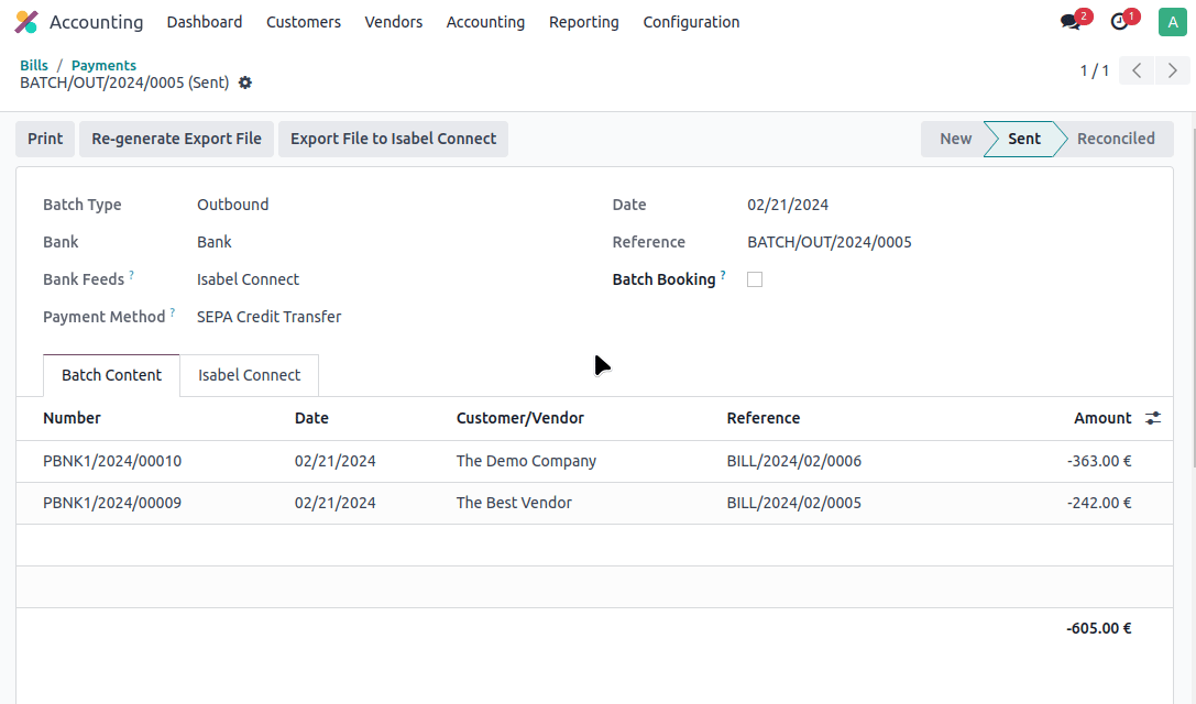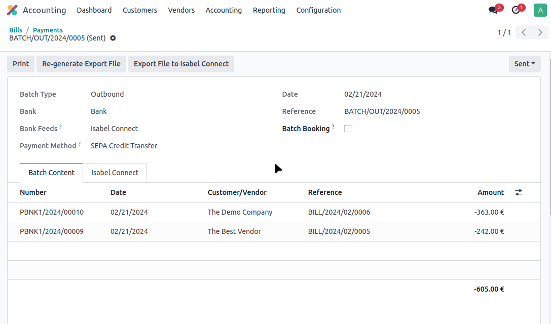 Of course, a status is displayed on the batch payment once the SEPA is sent to Isabel.