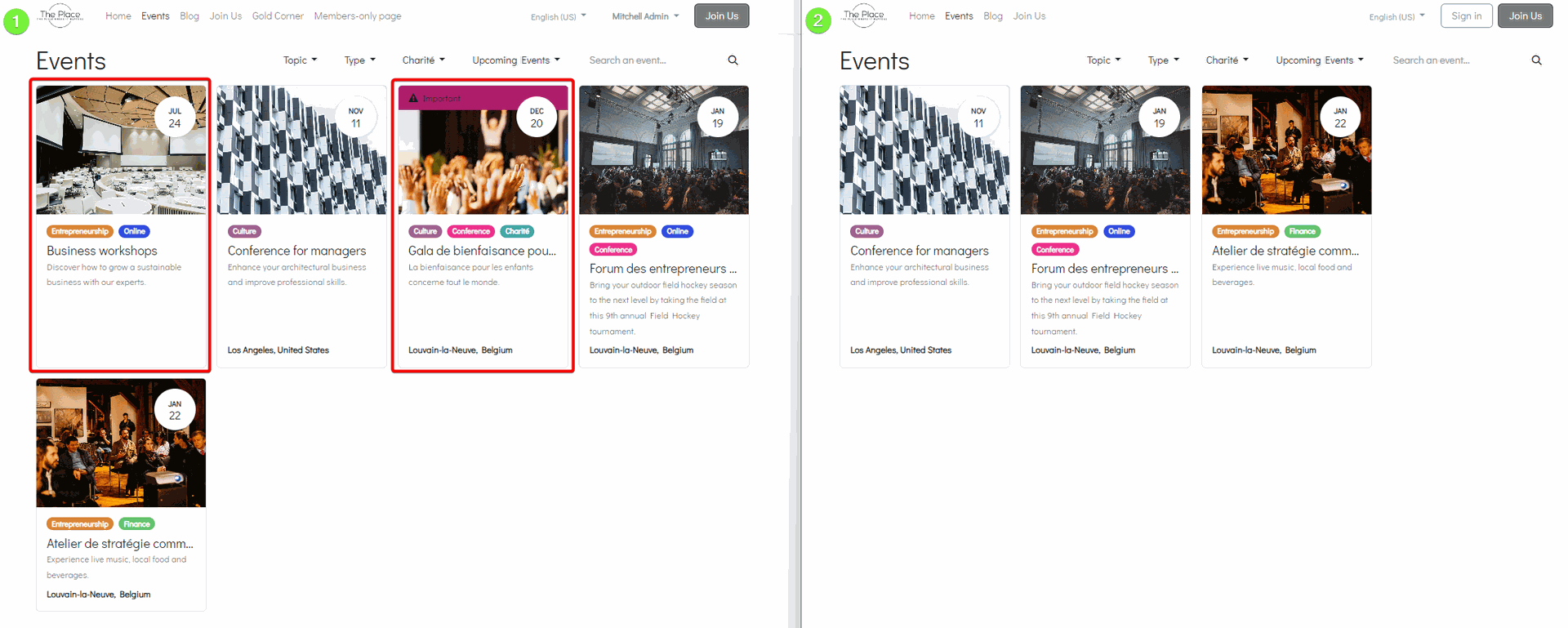 The screenshot below illustrates the difference in display between a member in good standing (left) and a non-member (right). We can see that the logged-in member has access to two additional exclusive events: the "Business Workshops" and the "Charity Gala", which are not visible to the non-member.
