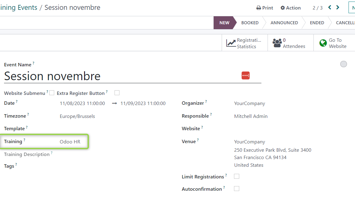 Classroom event type is now available. Link your event to a training and manage the registrations and the attendances. Allow your employees to register to a specific class from the agenda.