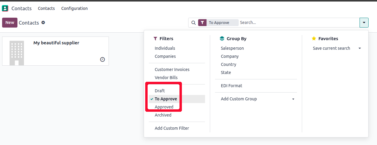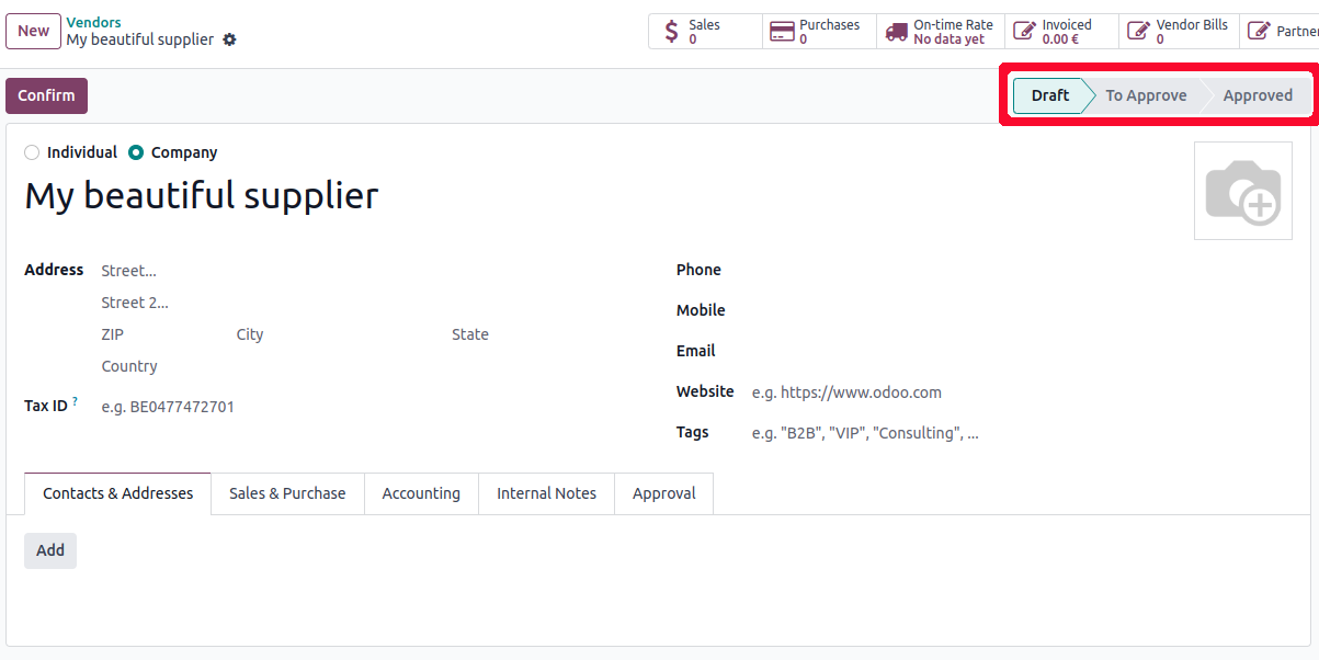 2. Within the supplier view, two buttons allow any user to transition the supplier to the 'To Approve' state.