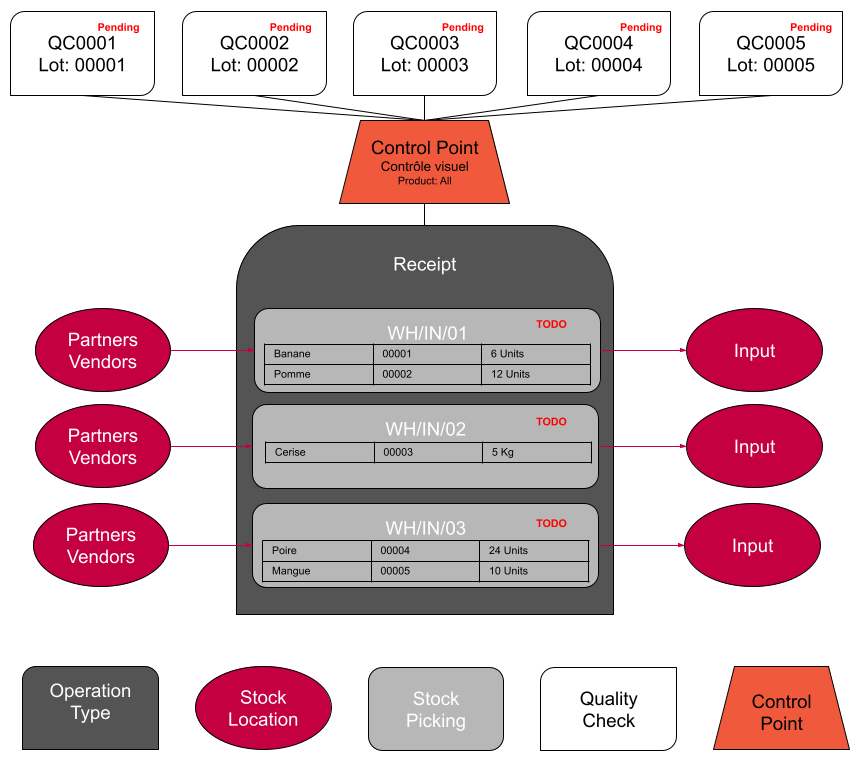 To reflect this flow in Odoo, we set up two control points. One that monitors receipts (Receipt) and another that monitors the selection of components (Pick Components).