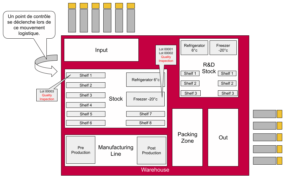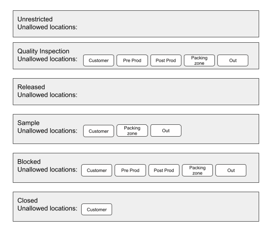 Following this configuration, a batch in the "Quality Inspection" status does not have access to delivery and production zones. However, it could be used in all stock and R&D zones.