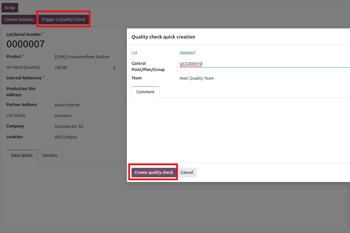 By validating the pop-up, Odoo will generate quality controls linked to the selected checkpoint. This action will simultaneously update the lot status to 'Quality Inspection'.