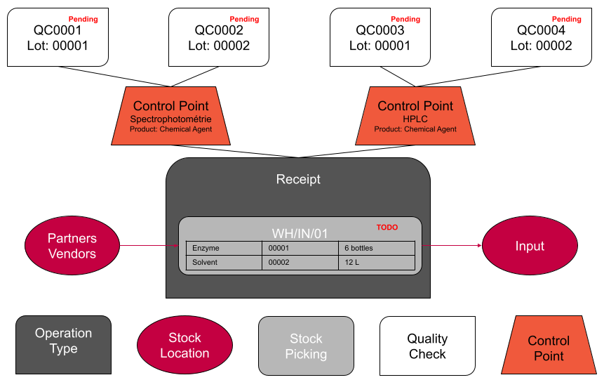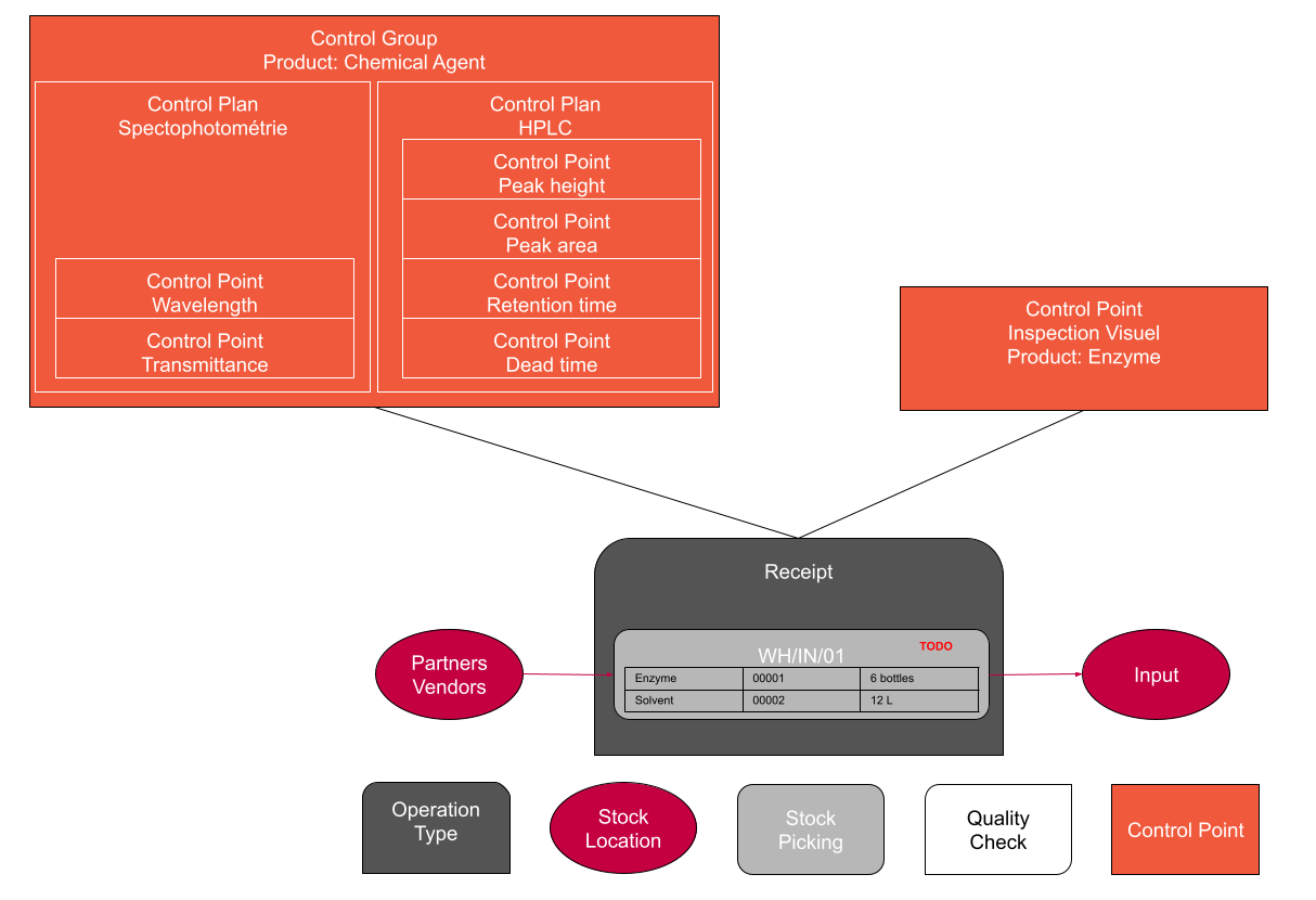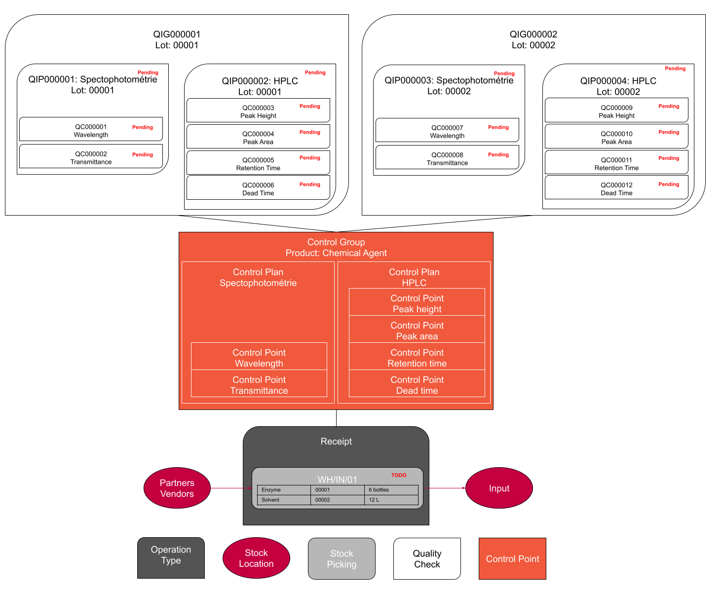 We have two control points that both monitor receipts and both apply to chemical agents. When we receive a batch of enzyme and a batch of solvent, the two control points are triggered and each creates a quality control per batch.