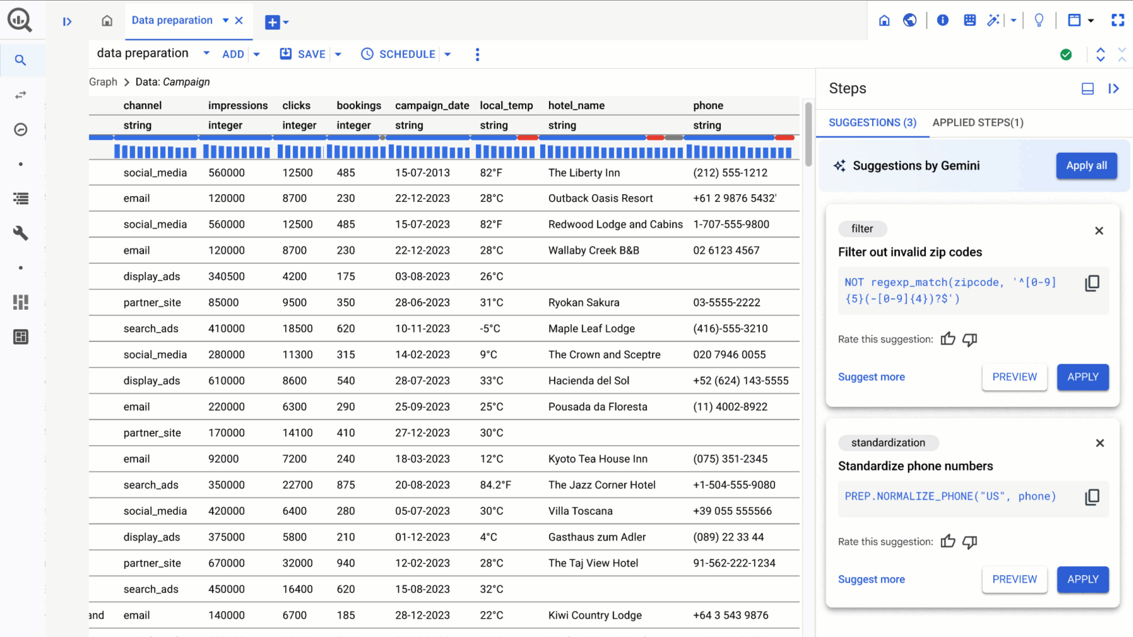 Google has also introduced a new data preparation tool based on its AI model, Gemini. With simple commands written via prompt, it is now possible to perform manipulations on the columns of a table.